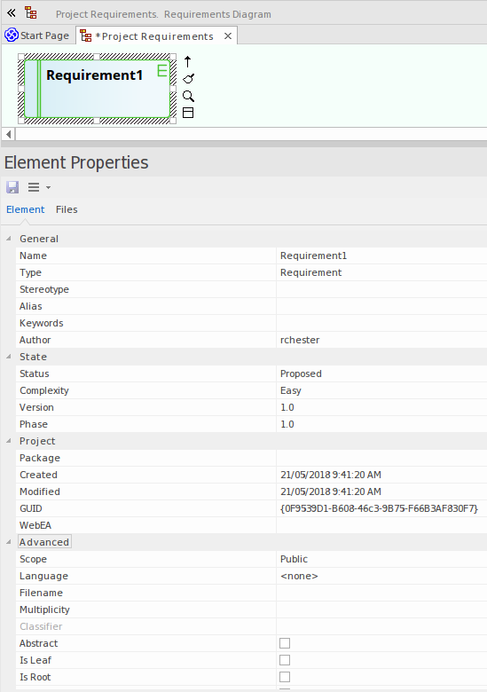 Models are constructed from elements, each of which has its own meaning, rules and notation. Generally, when you create a new element in your model, you want to use that element on a diagram. The simplest way to do this is to create the element directly on the diagram. In this procedure, we will use a Requirement element as the example.