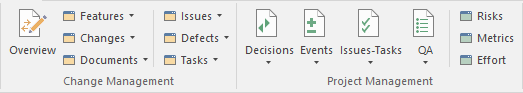 The 'Project Management' panel provides facilities for managing project-level items such as issues, events, tasks and decisions, for defining project risks, effort and metrics, and for obtaining an overview of the project status, including Quality Assurance reports and project statistics.