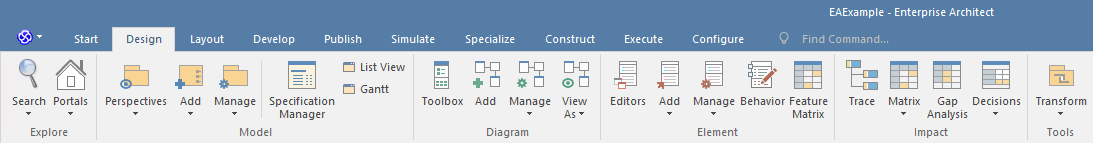 The 'Design' ribbon is used to develop and visualize a model by creating diagrams, matrices and lists of important aspects of the system. Requirements and other specifications can be created and viewed and, regardless of the technology or language of expression, compelling representations can be created, viewed and tied together to form either powerful blueprints of a system to be implemented or documentation of an existing system.