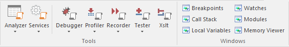 The 'Windows' panel provides access to a suite of windows associated with the debugging process, each of which provides information on an aspect of the application being debugged, particularly at a breakpoint. |