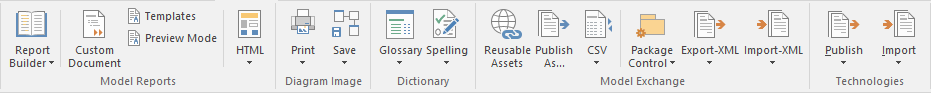 The 'Publish' ribbon brings together all the tools for publishing, documenting and importing and exporting valuable model assets in a wide range of formats and styles, ranging from publications for corporate audiences to spreadsheets, XML schemas, Patterns, Reusable Assets and much more. The model is the repository of valuable organizational information and knowledge, and people who don't access the model directly can still get access to this knowledge through this panel of tools.