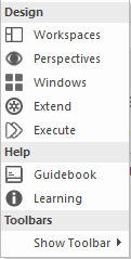 Not actually a Portal but a list of the 'floating' Toolbars that you can also anchor to the Toolbar ribbon above the work area. Toolbars that are currently active are marked with a tick. Click on the unmarked name of a hidden Toolbar to expose it either floating or anchored, and click on a ticked Toolbar name to hide that Toolbar. |