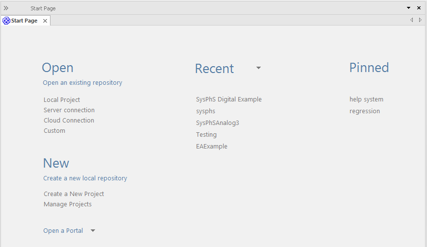 The Start Page is the default landing page that displays when you first open Enterprise Architect. It provides a range of useful commands to create and/or access project files, connect to a server repository, or access a project via the Cloud. You can also access a set of Portals that provide the facilities, resources, links, tailored searches and reports for working in a particular task area, such as publishing or developing a model.