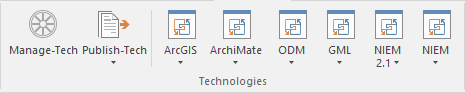 The 'Technologies' panel provides the icons for managing and publishing MDG Technologies in Enterprise Architect, and also an icon for each enabled MDG Technology available in your installation of Enterprise Architect. This topic identifies some of the Technologies that might be represented here. Each Technology icon displays a drop-down list of options for working with the Technology. These options might include: