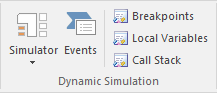The 'Dynamic Simulation' panel brings together a number of tools for working with Behavioral Model simulations. It provides access to a range of windows that allow you to control a simulation, set up simulation triggers and signals, set breakpoints, inspect local variables or view the Call Stack. It also offers a number of pre-defined model searches for retrieving recently modified StateMachines and Activity Graphs, and enables you to apply the appropriate Perspective and Work Space for the simulation you are performing.