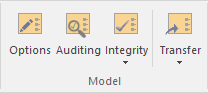 The 'Model' panel provides facilities to configure options for the current model, to check and repair the integrity of the model database, to transfer project data from one database to another and to configure auditing settings for recording changes to the model database.