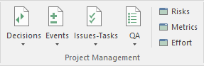 The 'Project Management' panel provides facilities for managing project-level items such as issues, events, tasks and decision, for defining project risks, effort and metrics, and for obtaining an overview of the project status, including Quality Assurance reports and project statistics.