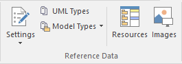 The 'Reference Data' panel is used to set up and manage the metadata for a model. Reference data such as Resources and Images is generally added as the model evolves. A wide range of additional model content such as Templates, Profiles, Patterns and Relationship Matrices can be stored as Resources. Images can be saved in the model and used as alternatives to the conventional geometric representations of elements, to appeal to non-technical audiences.