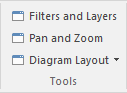 The 'Tools' panel provides a suite of facilities for aligning, viewing or filtering the elements in a diagram. These are powerful tools that assist in working with large or detailed diagrams. Filters and Layers can be used to separate out elements that aren't relevant in a certain context. The Pan and Zoom window helps you change a diagram's magnification, and to quickly traverse a large diagram. The Diagram Layout facility can automatically change and organize the layout of elements in a diagram.