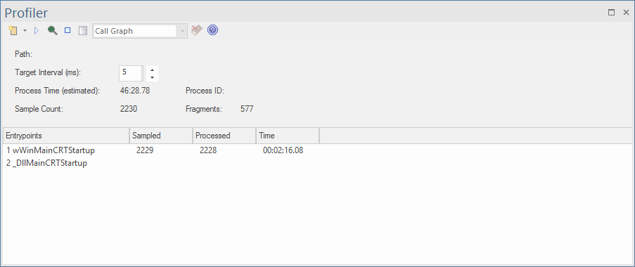 Note that the 'Process Time (estimated)' field shows an estimate of how long the process being profiled has been running, taking into account the interruptions to the process by the Profiler in collecting samples.