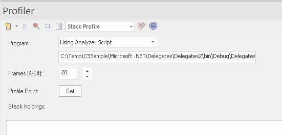 Profiler modes are selected using the Profiler control Toolbar. If a Profiler Point is already created, it is displayed. The Profiler Point is the point at which stack traces are captured. You can set the Profiler Point using the Set button on the control itself, once the mode is selected. After deciding on the Profile Point, build the project to be sure everything is up to date, then start the Profiler. The number of unique stack holdings detected is visible during the run.