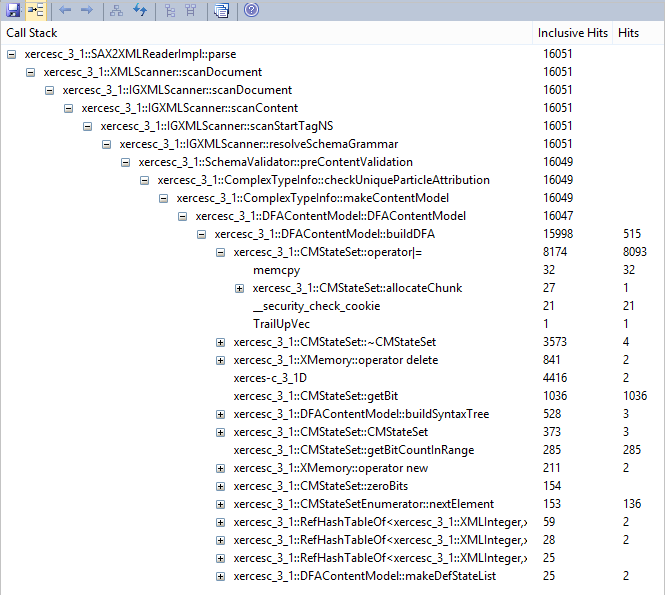This example is of a report produced from Profiling a demonstration program in the Xerces project from Apache. The program iterates over the Document Object Model (DOM) for a provided XML file.