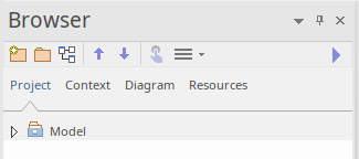 Enterprise Architect creates a new project file, places it in the specified location and then opens it automatically. The Browser window's 'Project' tab now displays a root-node named 'Model'.