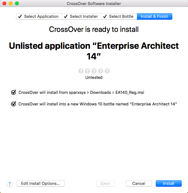 This page describes the process of installing Enterprise Architect using CrossOver under macOS. It is assumed that you already have CrossOver installed on your machine and that you have already downloaded the latest installer for Enterprise Architect.