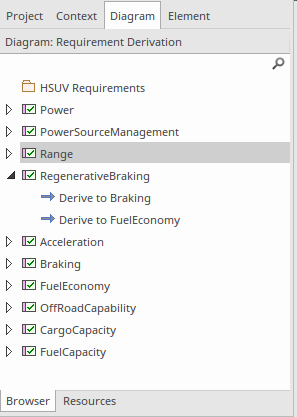 The Browser is the central navigation tool, which can be used to structure and explore the contents of a repository including working with requirements. The Browser has a number of tabs that allow the contents of the repository to be viewed in particular ways. We have looked at the Browser in an earlier topic, but will speak about its relevance for visualizing requirements.