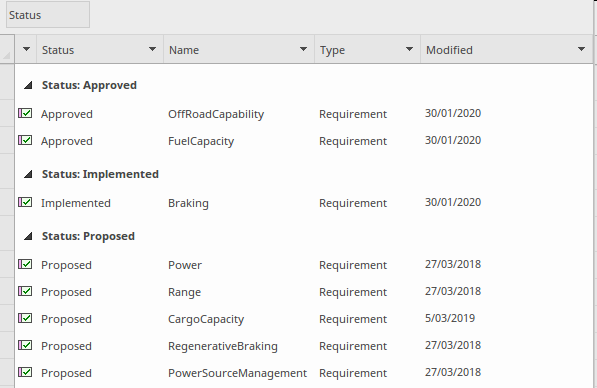 Any Package or diagram can also be visualized in a number of different ways, including the list view that provides an often welcomed view of the elements in a list, similar to a spreadsheet where the requirements are listed in rows and their properties are listed in columns.