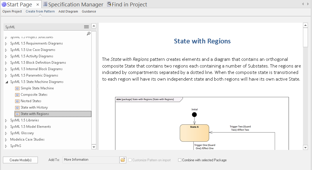 Enterprise Architect provides a useful starting point for modeling complex state behavior, by providing a series of model patterns that can be used to model all aspects of StateMachines, including modeling Composite States and Regions.