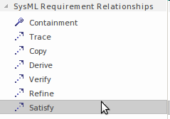 The Satisfy relationship is used to show that one or more model elements in the architecture or design fulfills the notion expressed in the Requirement. It is an important connection or bridge between what might be described as the problem or opportunity and the architecture, design and - when verified - the implementation.