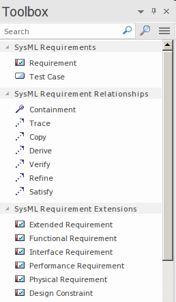 A Requirement diagram provides a way of visualizing Requirements and their connections. It is not just the relationship between any two Requirements, but the relationships between Requirements and other types of element such as Use Case, Activity and Block that can be visualized on these diagrams. Two of the elements provided in the Toolbox are: