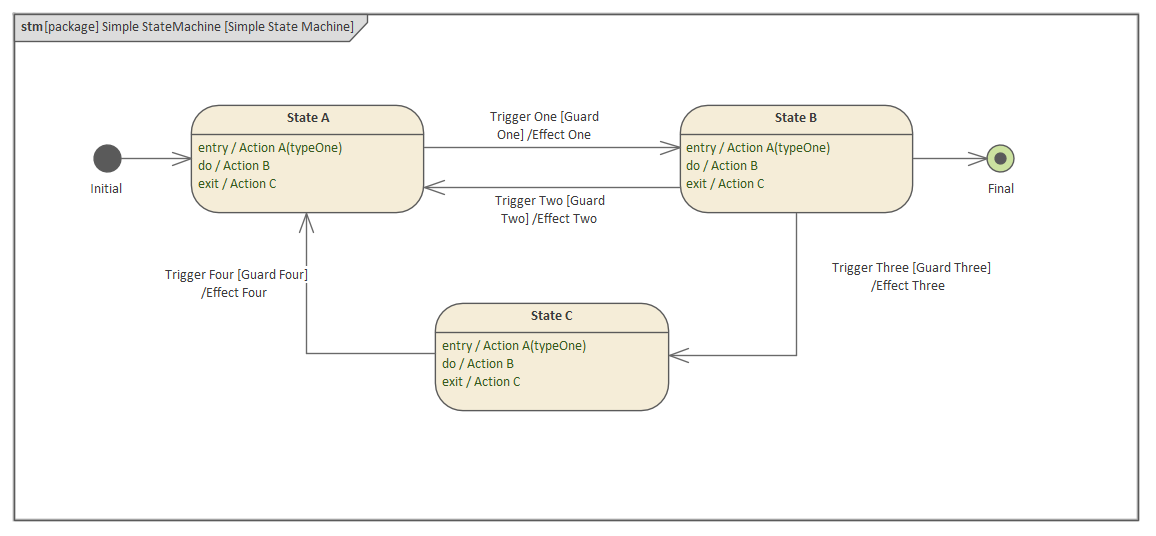 The pattern can be used to create a number of different StateMachines; in this example we create a simple (single region) diagram that has all the appropriate detail added to the States and the Transitions. A modeler can create this diagram in the appropriate location in the repository and then edit the States and Transitions and diagram to make it suit their own modeling context. The initial StateMachine diagram created from the pattern will resemble this: