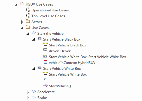 The Sequence diagram has two axes; by convention the horizontal (x) axis represents the Block (Instances) that participate in the interaction and the vertical (y) axis represents time. The Blocks do not have to be ordered in any prescribed way, but a modeler will typically place them in the order that is most illustrative and that order is often based on when they are used in the interaction. Time does not run on a linear scale and the time scale between any two diagrams could be quite different. For example, the time scale on Sequence diagram representing a high speed photographic system would be very different to the scale on a diagram representing a grocery checkout machine. This diagram shows the location of two Sequence diagrams ('Start Vehicle Black Box' and 'Start Vehicle White Box') that are child nodes of a Use Case named 'Start the Vehicle'.