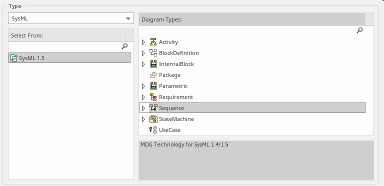 Selecting this option will open the 'New Diagram' dialog allowing you to name the diagram; initially the name will default to the name of the Package or element that contains the diagram. With the SysML perspective chosen and the version of SysML selected a list of diagrams will be displayed, allowing the selection of the Sequence diagram. Once the is selected a new Sequence diagram will be created in the location selected in the Browser window. The diagram canvas will be opened allowing you to start adding elements and connectors that describe the important interactions between objects. Enterprise Architect will also display the Sequence diagram Toolbox pages that contain the elements and relationships defined by the SysML specification as applicable for constructing Sequence diagrams. Any number of other Toolbox pages can be opened if required, in addition to the Common Elements and Common Relationships pages that will always be available.