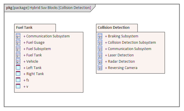 Architect provides numerous ways to display Packages in diagrams that will assist users in understanding the structural relationships between Packages and the elements and diagrams they contain. When a Package is included in a diagram, the tool allows the user to choose from a number of display options and the compartment visibility can be changed to show the Package content. In this diagram the author wants to show the contents of two Packages that have significance in the unlikely event of a collision. The 'Show Package Contents' option has been selected in the element compartment visibility making it clear what elements are contained in each Package.