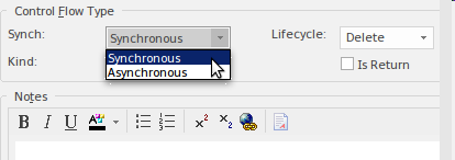 Enterprise Architect by default creates Synchronous messages, but the message type can be altered by setting the 'Synch type' property on the 'Properties' dialog. When the message type is set to Synchronous (default) this sets the line style to solid with a closed arrow head pointing to the recipient Instance. The line can be annotated with the name and parameters of the message.