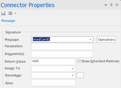 The sender is effectively calling or activating some behavior provided by the receiving lifeline. Enterprise Architect provides useful mechanisms to utilize behaviors already defined in the form of operations. This illustration shows the properties of an existing message, which the modeler is able to select from a drop down list of previously defined operations. Alternatively, the modeler can define a new operation by selecting the Operations button.