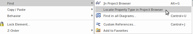 Enterprise Architect has a useful search feature that allows the type that a property is based on to be located in the Browser window. This function is particularly useful for finding the owning Block or constraint of a Block or ConstraintProperty found on Parametric and Internal Block diagrams.