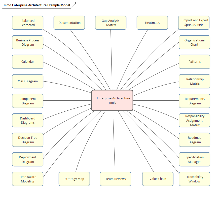 This Mind Map shows the landscape of the key Enterprise Architecture tools that can be used to set up and maintain the architecture office and to plan, create, manage and document architectures. While these are the primary tools there are a series of other tools described in the Help topic Additional Enterprise Architecture Tools.