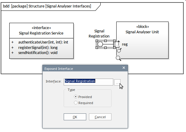 Interfaces added in this way must be typed by an Interface proper (an element stereotyped as <<interface>>). This can be achieved by first selecting the Interface in the diagram and then selecting the Properties window from the Interface's context menu. You can then name the interface and use the [...] icon to navigate or search for the Interface element. This diagram demonstrates the step for a Signal Registration Interface.