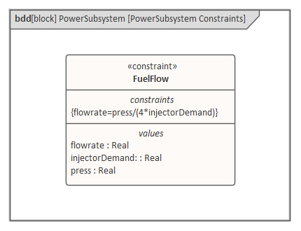 In an earlier topic we learnt how equations can be modeled using the Block Definition diagram, with the Part Association relationship articulating the variables (parameters) of the equation. This provides an essential mechanism for re-use. As a refresher of how we use a Constraint Block to model equations refer to this diagram, which uses a Constraint (which is a stereotyped Block) to model a vehicle's fuel. The Fuel Flow Rate is based on an equation that has fuel pressure (press) and fuel demand as variables (parameters).