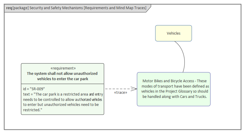 The nine diagrams described earlier are individually specified to convey a particular aspect of an engineering opportunity or solution; for example, the Parametric diagram is intended to show how equations are constructed. There are, however, a number of types of element that are universal to the model endeavor and can appear on any type of diagram. Many of these elements are used on diagrams to convey important annotations to a model or to help explain a particular aspect of the model. They include elements such as Notes, Constraints, Rationales and Views. In this diagram a stakeholder who has been viewing the model has added a comment to question a part of the model.