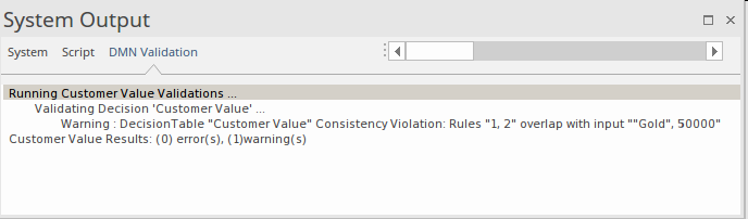 Once again we can use Enterprise Architect's built-in validation facility to help us identify any violations. In an analogous way to the completeness rules, the validator can find the errors that, if the table were any more complex, would be difficult to find. This illustration shows the violation generated to the System Output window identifying the rules and the values that are in violation.