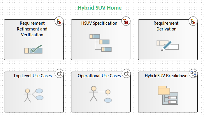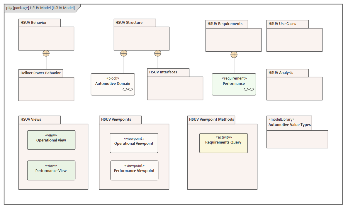 This Package diagram shows the structure of the model used to define the HybridSUV system. The diagram provides a useful way of viewing the high level containers (Packages) used to structure the repository and define the structural, behavioral and requirements of the HybridSUV system.