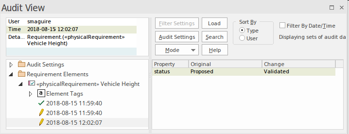 This is a particularly useful feature in Systems Engineering, where there are regulatory or compliance aspects to a process or when faults have to be traced back to their design or requirement specification. Auditing would typically be set up and administered by a librarian or administration function within the team. Auditing can be enabled, set up and viewed using the ribbon option 'Settings > Model > Auditing'.