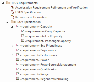 Enterprise Architect provides a wide range of facilities that can be used for the development, visualization, management and documentation of Requirements as first class elements. People reading general SysML textbooks will often come away with the idea that Requirements are expressed on diagrams, but Enterprise Architect provides a wide range of other ways to visualize Requirements that will assist the engineer when working with them as text based elements, including being able to visualize them in a hierarchy in the Browser window.