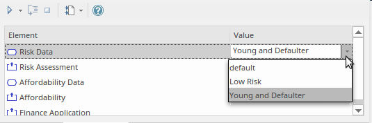 The next step is the selection of the Input Data required for participant decisions and BKMs. This facility is one of the reasons Enterprise Architect is a market leader in this field, as it allows a modeler or a team to run the simulations with different input data that can be saved as a set and reused to visualize how the Decision Model will respond in different contexts.