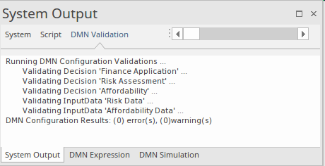 It would, however, be considered good practice at this point to run a validation check which would be run for all Decisions and Business Knowledge Models (BKMs) in the diagram. This option is available from the Simulation window toolbar and allows you to check that there are no syntactic or semantic (overlaps and gaps) in the expressions before running the simulation. If the validation results in errors it would be judicious to correct the problems before running the simulation.