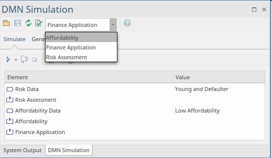 Setting up a simulation is straightforward; Enterprise Architect provides an Artifact that can be simply added to any Decision Requirements diagram to begin the process of configuring the Decision Model. The DMN Simulation Configuration element, available from the DMN Toolbox page, has the abbreviated name DMNSimConfiguration.
