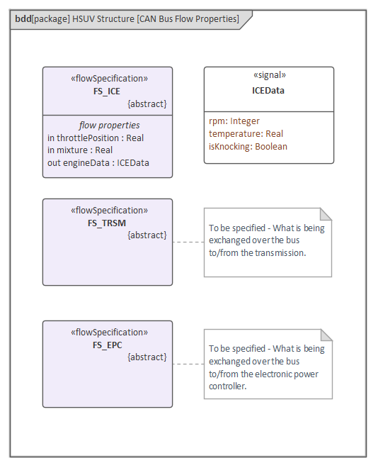 This diagram shows the first (unfinished) steps in the definition and refinement of a bus architecture. The modeler has used flow specifications to model the way that items will flow though the vehicle; for example, a flow specification has been defined for: