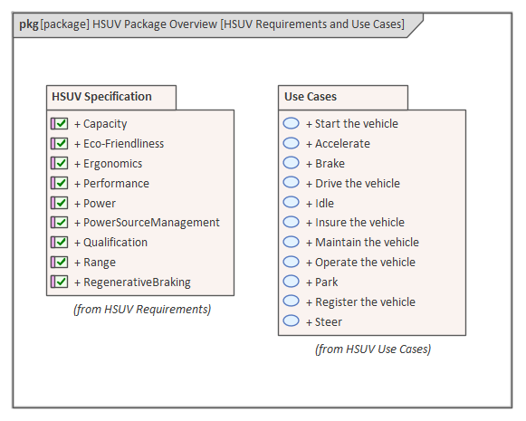 As with all SysML elements, there is both a graphical and textual aspect to the elements, notes can be added to each of the Packages and the relationships to clarify the purpose of the element or the connector. The Package diagram can contain any type of model element but typically it contains Packages. Enterprise Architect extends the SysML specification by providing a number of different and innovative ways to visualize Packages and their content on a Package diagram. These options can be seen in the menu that is displayed when a Package is dragged from the Browser window onto a diagram.