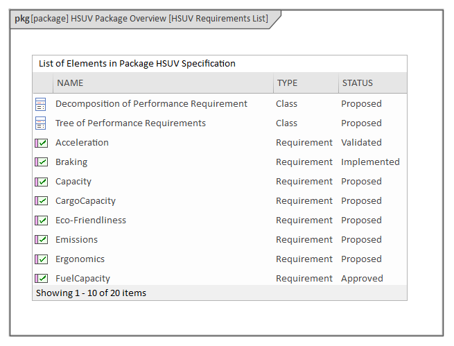 In the next diagram the engineer has chosen the 'Package as List' option, which relies upon auto-generated but user-configurable SQL code to create a dynamic list of elements based on any of the Package element's metadata. Here we see the same list of requirements but this time a number of properties are also displayed.