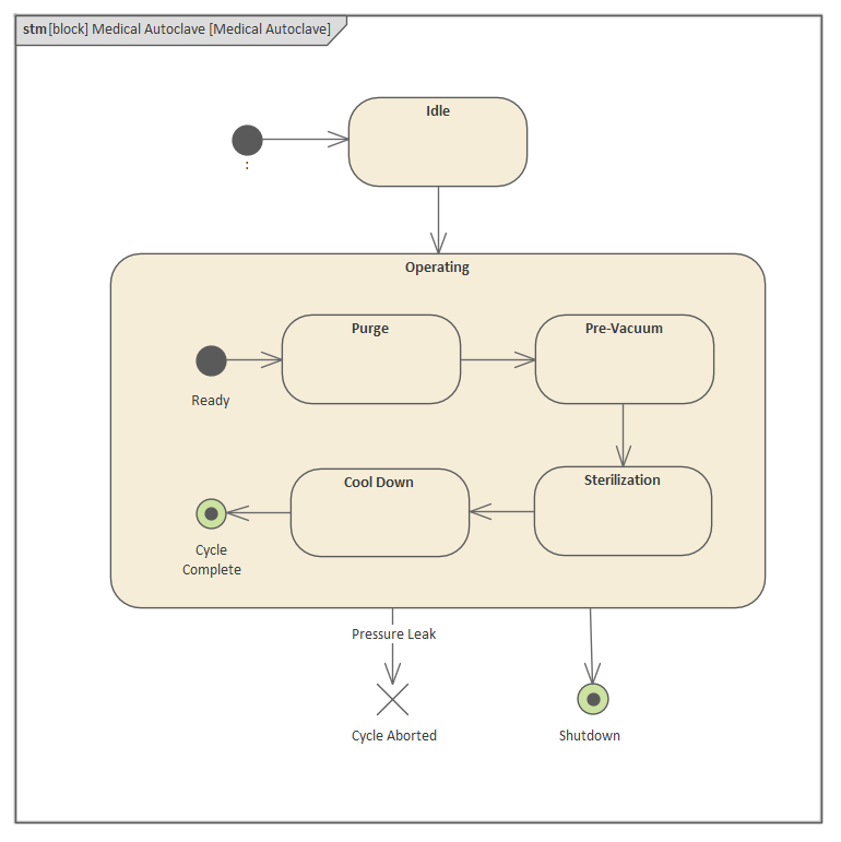 The Terminate pseudostate is a useful node to ensure that an entire StateMachine is shut down. Regardless of what level in a State hierarchy the node is located, all regions and all levels of the hierarchy will terminate. It is a final node in the sense that the owning StateMachine will immediately stop executing. The termination is not 'graceful' and any behaviors that are currently being executed will simply stop; no exit behaviors will be executed. This diagram shows a Composite State with a single region; if there is a Pressure Leak the operation of the Autoclave must be immediately terminated, so there is a transition from the operating state to the Cycle Aborted Terminate pseudostate.
