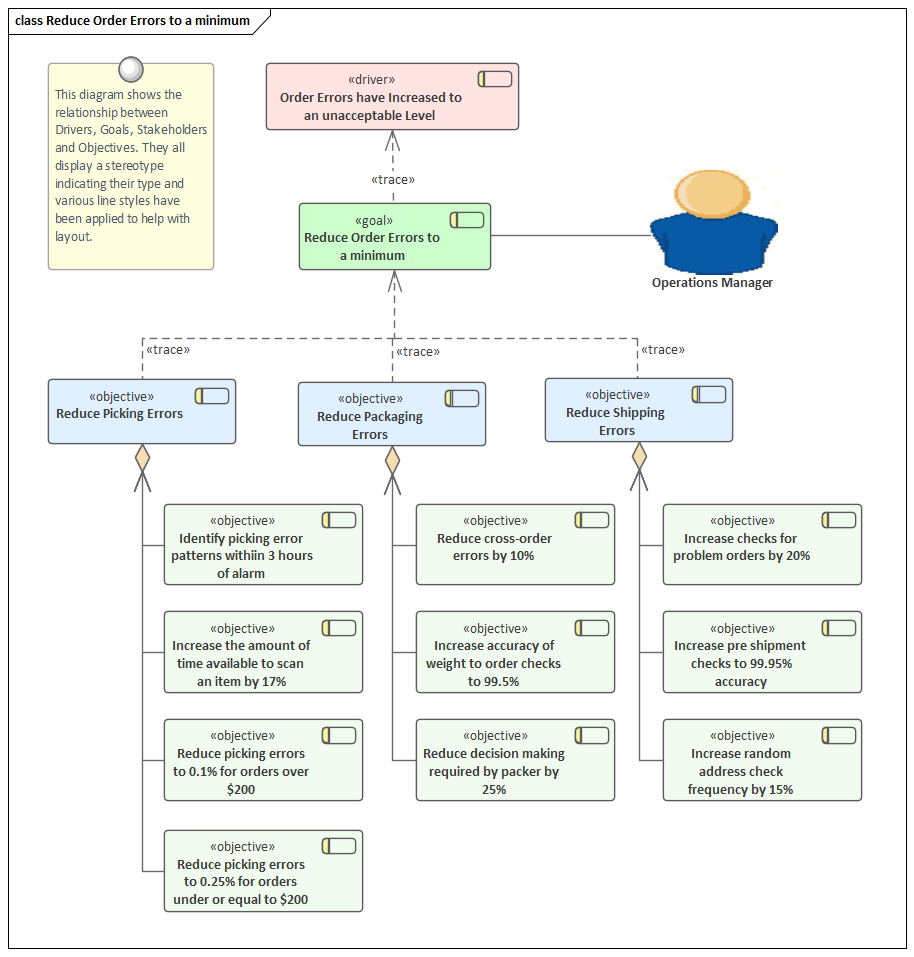 Enterprise Architect can be used to model the Goals and Objectives and relate them to each other, with each Goal being decomposed into a number of Objectives that can be measured. Stereotypes can be used to create Goal and Objective elements, and these can be added to any number of diagrams. The Browser window provides a way of structuring the Goals, adding the Objectives as child elements placed under the applicable Goal. The Specification Manager is a useful tool for creating, viewing or presenting the Goals and Objectives in a workshop. It is a text based tool and allows the Goals and Objectives to be viewed in a word processor or spreadsheet interface.
