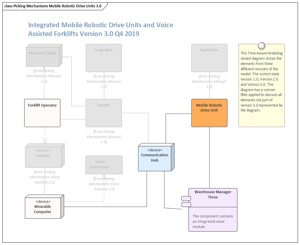 There is a wide range of tools that can be used in conjunction with Time Aware Modeling, such as the ability to filter a diagram to only highlight elements that are part of the version represented by the diagram. The effect of this will be to obscure all elements other than those that have been added or cloned into the specified version. The Traceability window can be used to keep track of the complex relationships that exist between different versions of the elements. Diagram Legends can be used to color the diagram's elements based on the version they belong to, effectively creating a colored chronology of change or transition from version to version. Diagram Filters can be used to obscure elements based on more complex criteria, such as to display only the elements that are part of either version 2 or 3 and that have a status of 'Approved'.