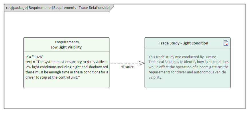 In this diagram the modeler wants to show that a Requirement has a relationship to a trade study represented by a Document Artifact. The document might have been written in Enterprise Architect or it might be a linked external document.