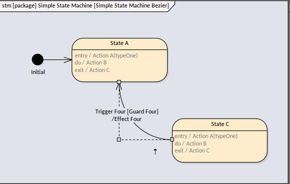 Enterprise Architect has a wide range of tools and facilities for working with diagrams, including StateMachine diagrams, and these can be used to help create and visualize the information codified in the StateMachines. Particularly useful when working with Transitions is the ability to route connectors that help make the diagram more appealing. The line style for the connector in this diagram has been set to a Bezier Curve, giving the Transition a less rigid appearance.