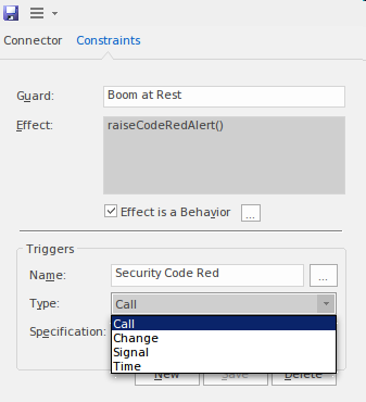 This screen capture demonstrates how the Trigger, Guard and Effect can be entered and viewed in Enterprise Architect.